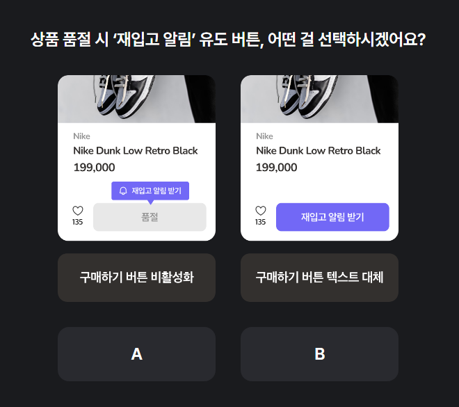 사실 보다 정확한 정보를 전달하는 것은 A안이지만 B안을 선택하고 싶다. '재입고'라는 단어가 현재는 창고에 물건이 없다는 뜻을 내포하고 있기 때문에 '재입고 알림 받기'는 품절 상태일 때 뜨는 것이 당연하고, 사용자의 반응을 이끌어내는 데에는 <보조설명을 하는> 툴팁 형태보다 <누를 수 있는> 버튼 형태의 UI가 더 적합하다고 생각해서다. 내가 사용자라고 할 때, A와 같은 형식이면 (비록 포인트 컬러가 들어갔더라도)툴팁과 상호작용할 수 있는지 여부가 모호해 아, 품절이구나. 생각하고 자연스럽게 다른 페이지로 이동할 것 같다. 가장 좋은 방안은 별도의 레이어를 추가해 이미지 부분의 색을 누르고 상단에서 품절 상태임을 알린 다음 하단 버튼을 '재입고 알림 받기'로 설정하는 것이라고 생각한다.