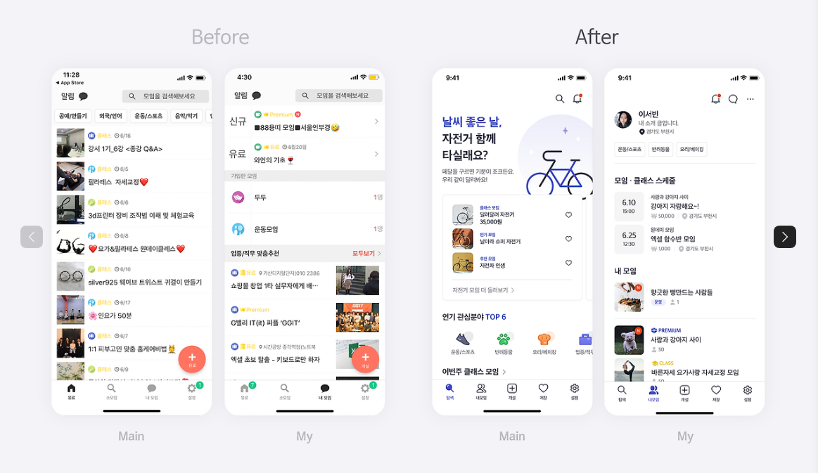 - 인기 관심분야 Top 6, 이번주 클래스 모임/인기 모임/신규 모임 등 카테고리별로 목록을 분류해 사용자가 관심 있을 만한 정보를 제공하는 것은 좋은 방향이라고 생각했다.