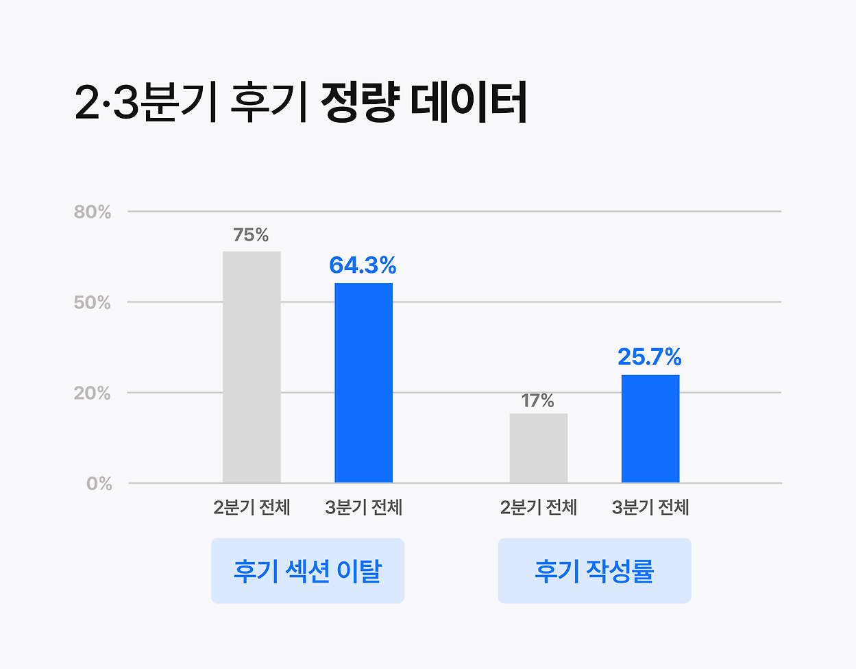 - 실험 기간에 맞춰 결과 확인. 후기 섹션 이탈률 11% 감소. 후기 작성률 8% 증가. 후기 관련 VOC 감소.