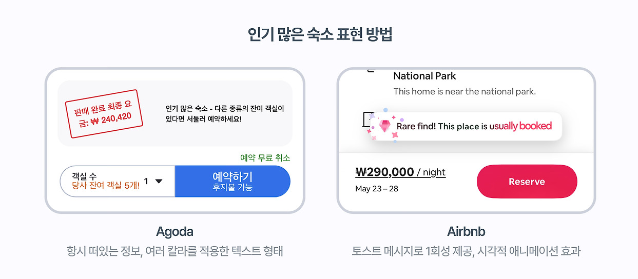 다양한 색상을 활용한 텍스트 위주로 정보를 전달하는 아고다와 달리, 에어비앤비는 토스트 팝업과 아이콘 모션을 활용한 인터랙션을 사용해 사용자의 시선을 집중시킨다. 잔잔한 색감, 큼직한 UI로 안정감을 제공하며, 부드럽게 전환되는 애니메이션이 전체 플로우를 따라갈 수 있게 돕는다. 간결한 정보는 피로도를 낮추고 중요 결정에 집중할 수 있도록 한다. 에어비앤비는 이렇게 좋은 숙소를 빠르게 찾아야 하며, 실수 없이 결제를 진행해야 한다는 부담을 느끼는 사용자에게 심리적인 안정감을 제공한다.