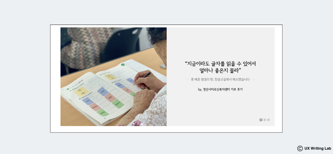 사람들은 기업에서 하는 말보다 고객이 한 말에 더 영향을 받는다. 해피빈과 굿네이버스의 수혜자 증언을 보면 내 후원이 사람들의 삶에 가치 있게 쓰일 것이라는 믿음을 준다. 사용자 증언은 서비스의 핵심을 사람의 말로 생생하게 전달하는 역할을 하는 한편, 얼마나 많은 사람이 그 효용을 얻었는지도 보여줄 수 있다. 하지만 사용자 증언은 그 자체로 중요한 것이 아니라 글의 목적을 달성하도록 도와주는 것이 중요한다. 정확한 목적에 맞게 사용자 증언 데이터를 활용하자.