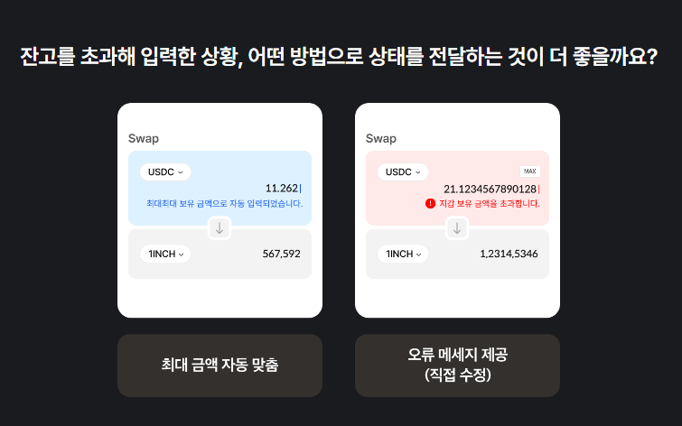 B안은 초과 입력 시 빨간색 오류 메시지로 상태를 전달해서 수동 수정을 유도한다. 왜 잘못되었는지 명확히 피드백을 주고, 자연스럽게 값 수정의 주도권이 사용자에게 흘러간다. 당연히 작업 흐름이 잠깐 끊기겠지만, 돈을 잘못 쓰는 것보다는 멈칫하더라도 직접 수정할 기회를 주는 편이 훨씬 낫다. 금융/투자 관련 내용은 잘 모르지만, 이렇게 돈이 오가는 때에는 사용자의 판단과 책임, 정확한 수치를 기반으로 한 UI가 맞다고 생각한다.